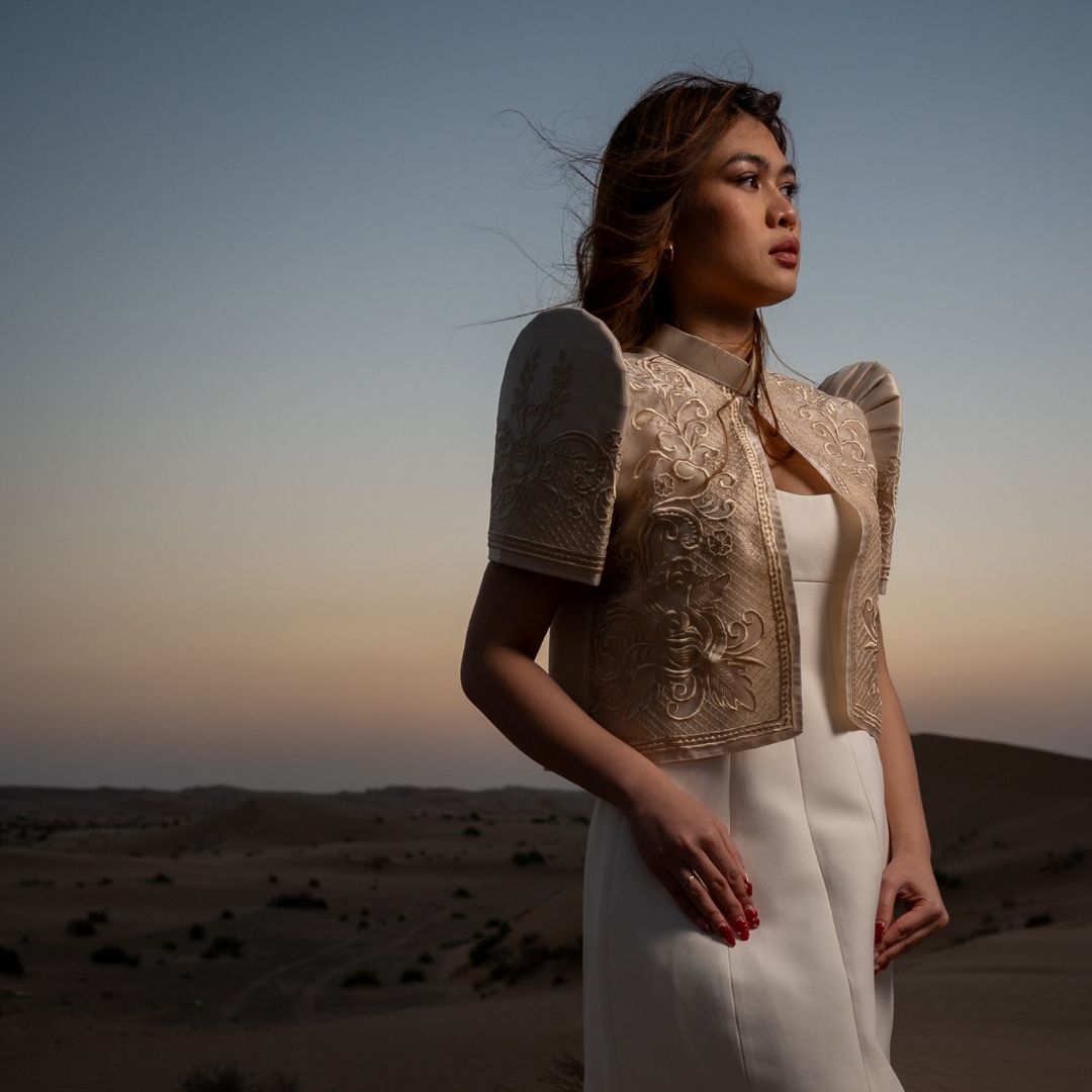 Gregoria TERNO, made from black organza silk fabric, is computer embroidered and tailored in Lumban, Laguna, the Philippines' capital of embroidery. Perfect Filipiniana outfit for special events when paired with Bituin Maxi Skirt.