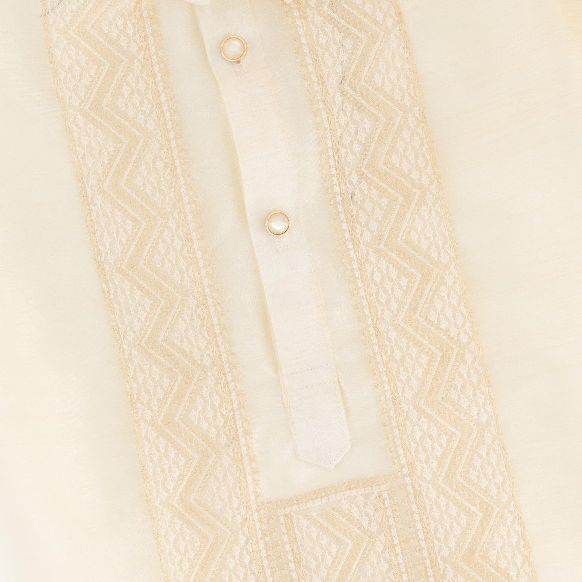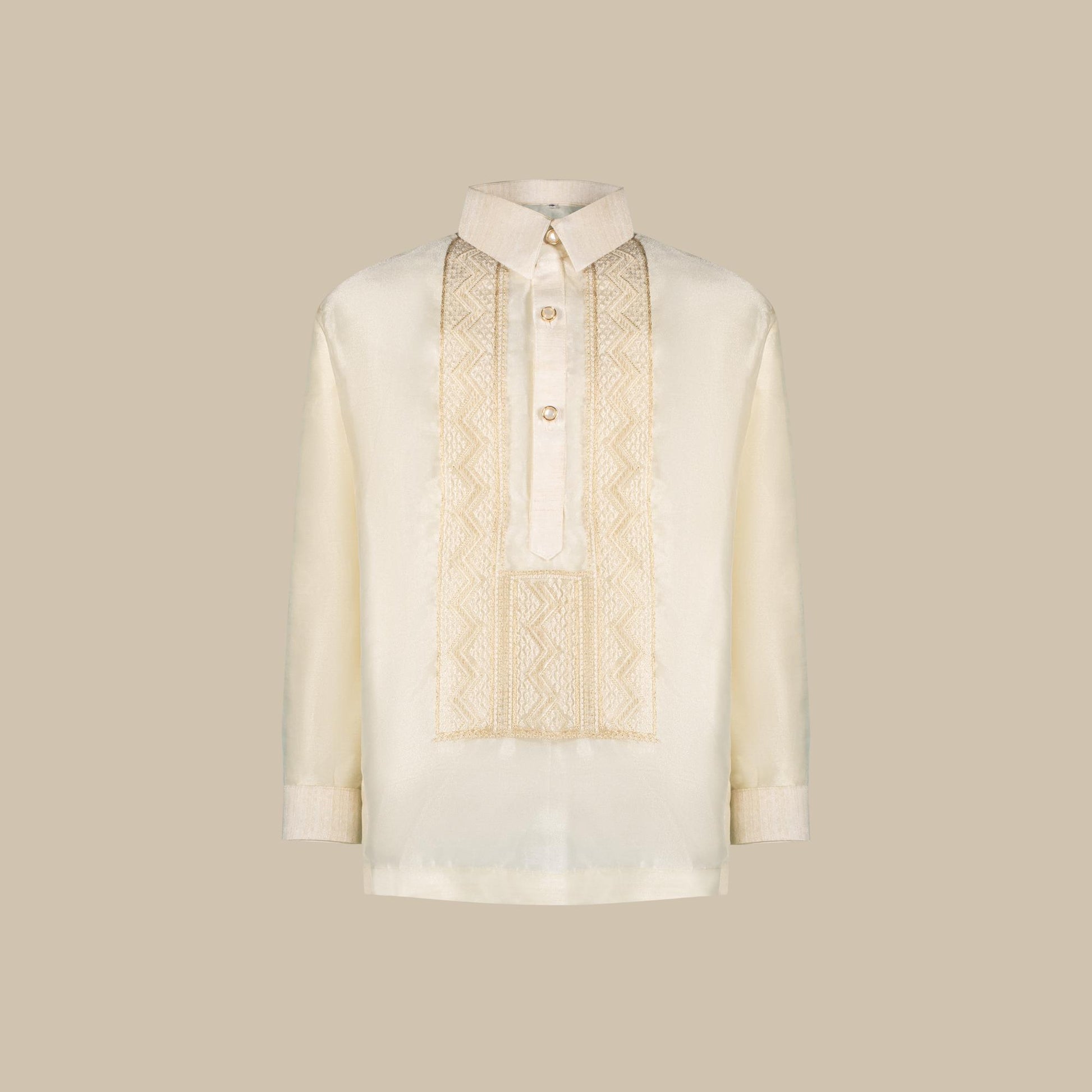 Barong Pambata is made from cream organza silk with cream embroidery details on the front and geena silk lining for added comfort. Sizes available are from 2 years old to 14 years old. This barong is available in one variant / color only.