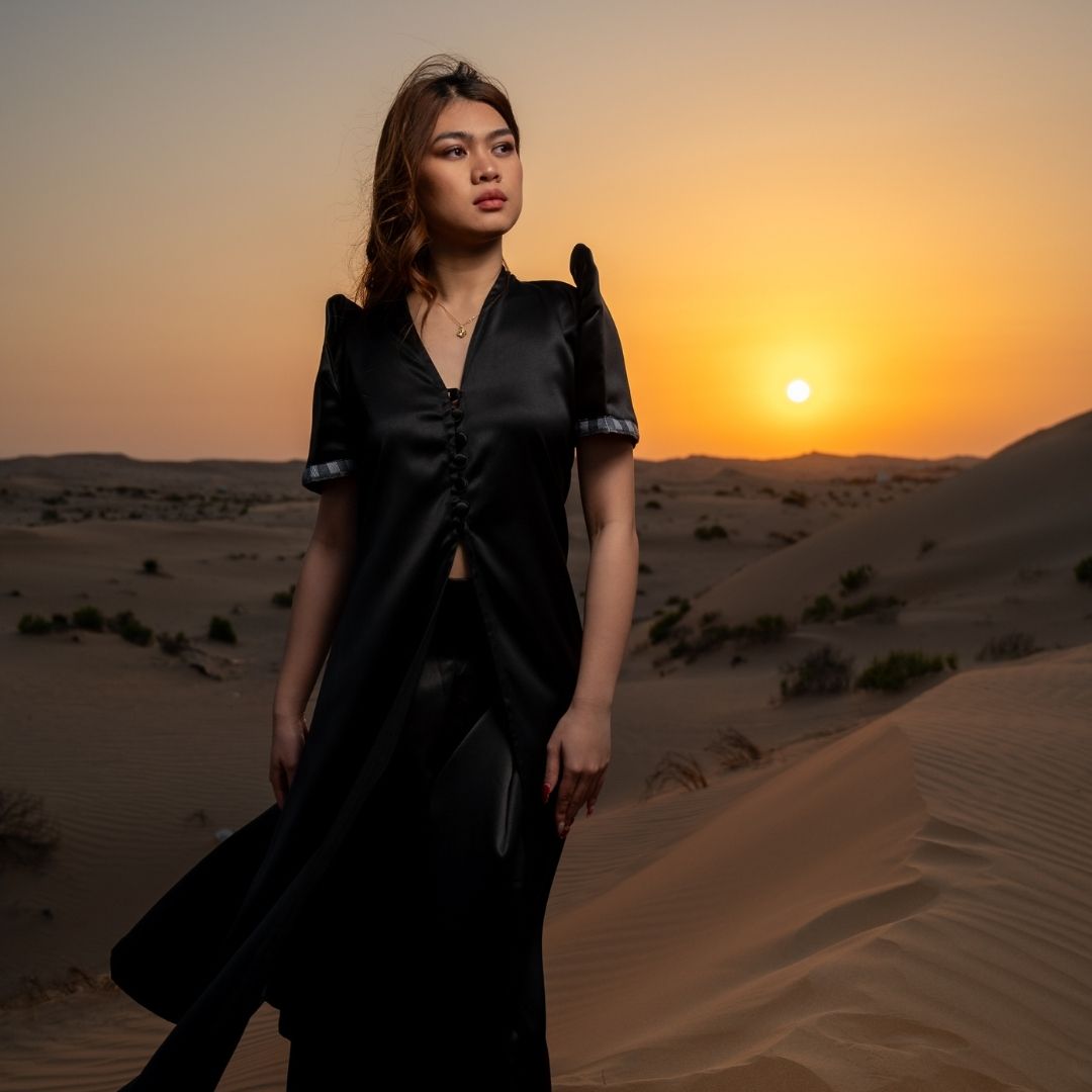 Discover the TERNO Overcoat—a stunning fusion of Filipino heritage and Middle Eastern elegance. Inspired by the traditional abaya, this piece features signature butterfly sleeves and refined piping crafted from Binakol fabric, a treasured textile from Abra, Philippines. Tailored from luxurious Russian satin silk hand-tailored by Filipino artisans, the overcoat drapes beautifully with effortless flow and sophistication. Culturally rich yet versatile, it pairs seamlessly with TERNO's wide-leg trousers or elevates any existing wardrobe. Own a garment that celebrates tradition while making a bold, contemporary statement.